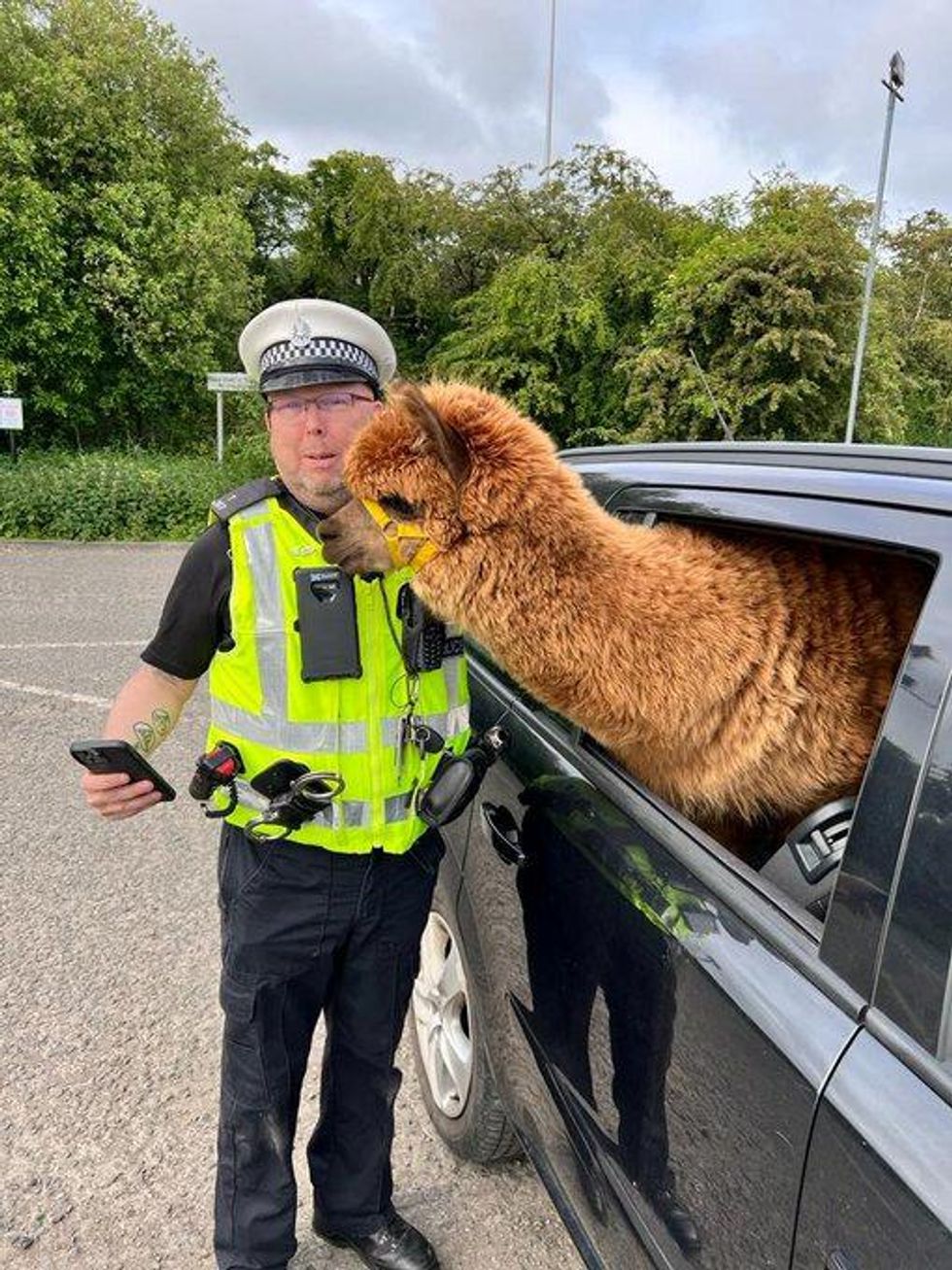 Earlier this week, when a traffic officer stopped a car, he was met with the travelling alpaca peering out of the window.