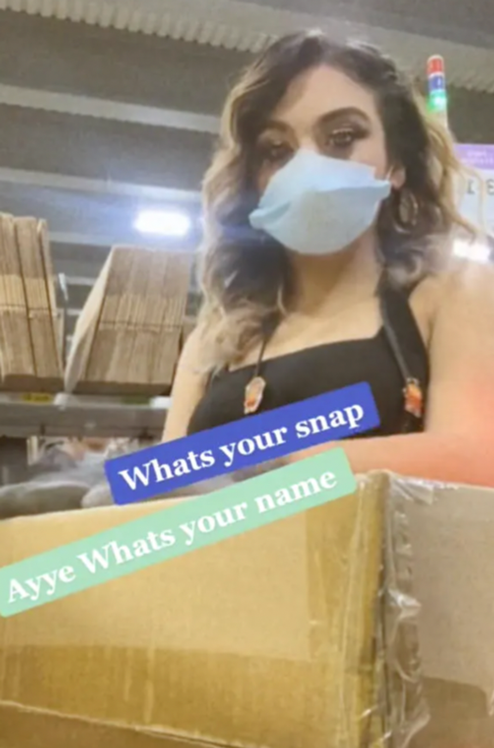 The video starts off with Priscilla sitting alone in her car, then shows her working in the warehouse and being approached by men. The text overlay of the clip shows the comments they usher her way: “What’s your snap [Snapchat]?” “Let’s chill on break.” “Ayye what’s your name?”