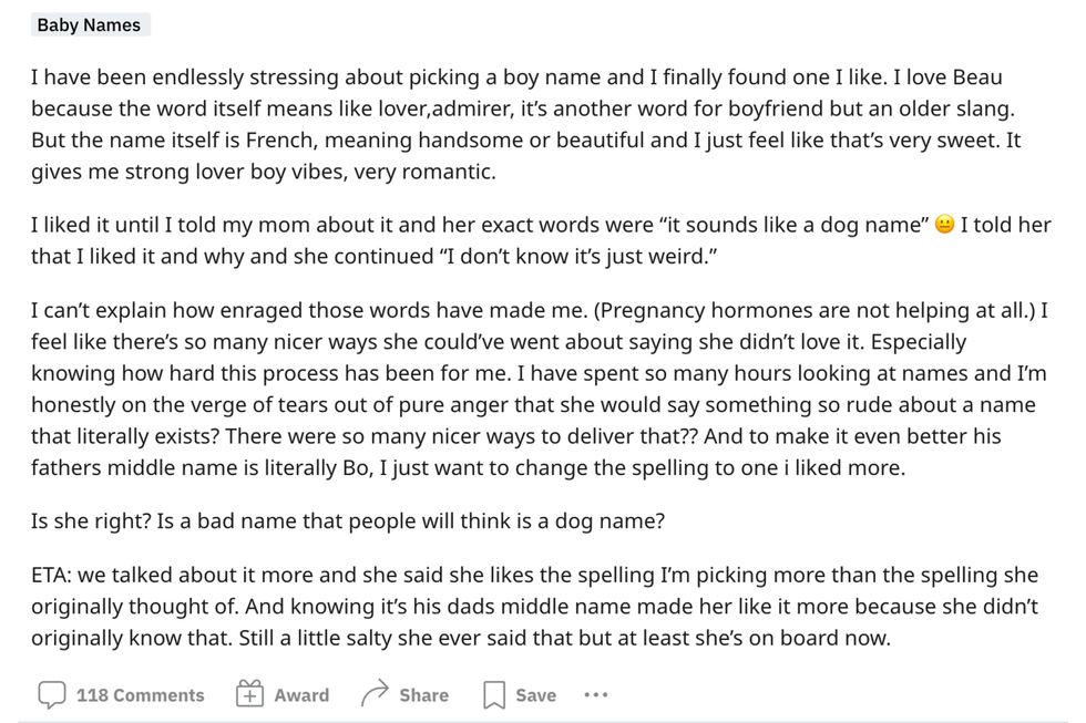 “I have spent so many hours looking at names and I’m honestly on the verge of tears out of pure anger that she would say something so rude about a name that literally exists? There were so many nicer ways to deliver that?? And to make it even better his father's middle name is literally Bo, I just want to change the spelling to one I liked more.”