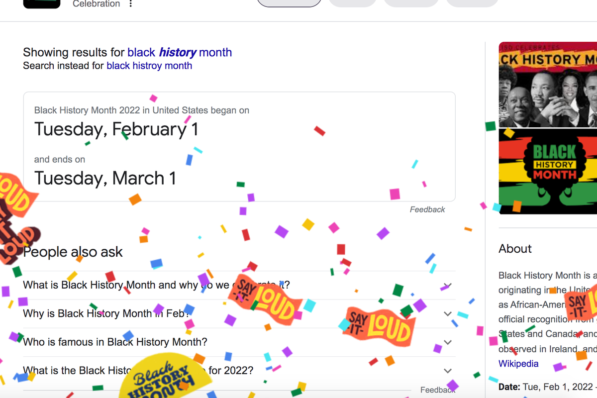 As soon as you type in Black History Month, mutlicoloured digital confetti and the phrase "Say it loud" appear in blue, maroon, yellow and orange boxes floating across the screen.