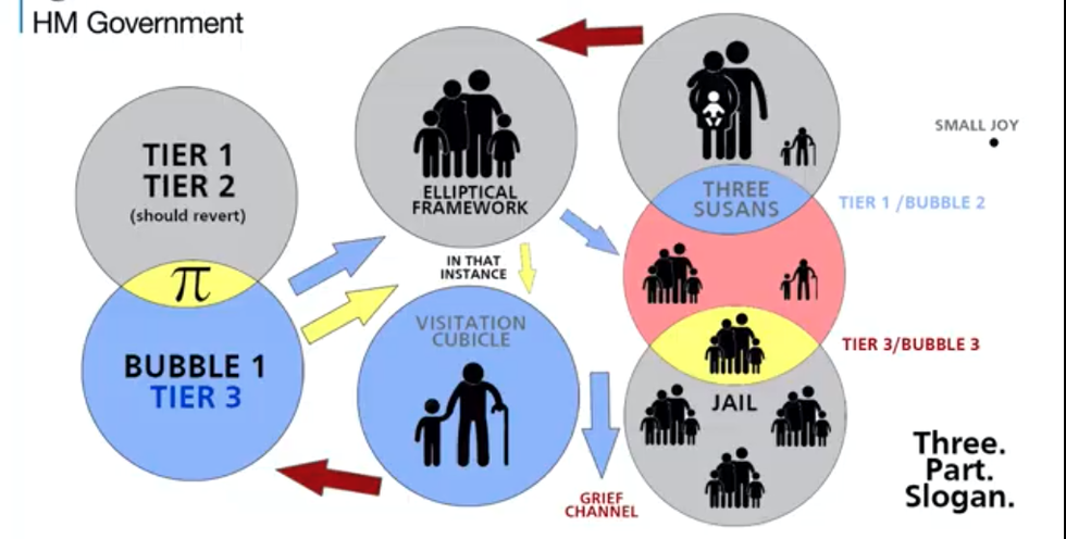 “Using the words ‘very clear’ again, Christmas bubble is one bubble, or two bubbles if one is a support bubble. Bubbles remain within tiers unless tiers trump bubbles. Bubbles cannot visit shops but can go to parks in bubbles within tiers. Elderly relatives in one bubble, but not other bubbles. Very clear.”