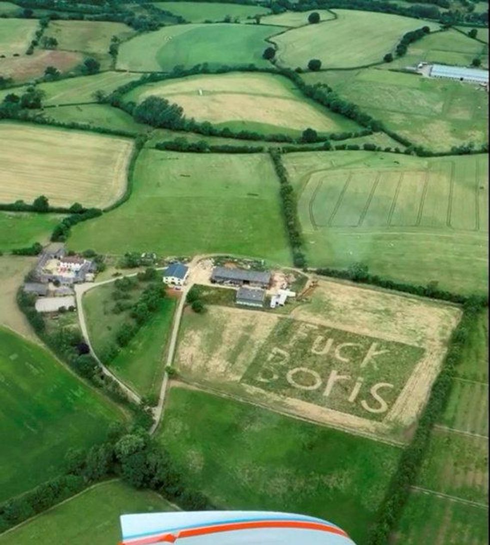 A microlight pilot spotted huge letters in a farmer's field spelling out - 'F*** BORIS'.