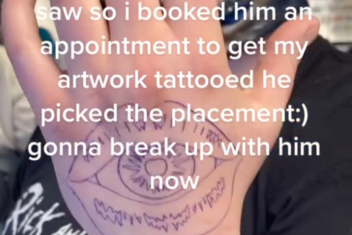A woman appeared to trick her boyfriend into getting a hand tattoo of her artwork after she went through his phone - then she dumped him.
