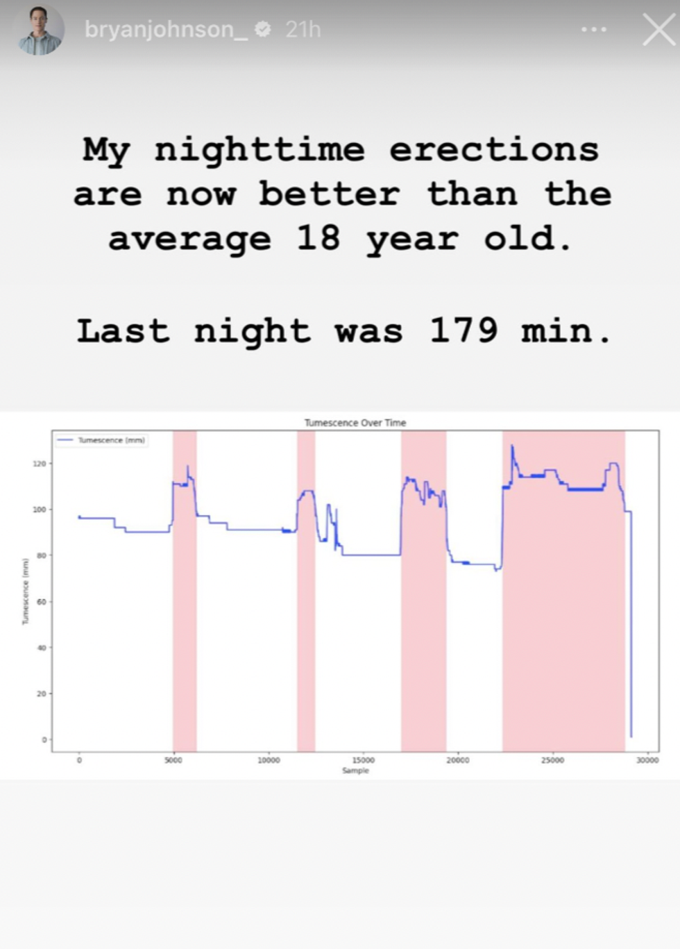 On his Instagram Story, he shared a screenshot of a graph, writing: "My night time erections are now better than the average 18-year-old. Last night was 179 minutes."