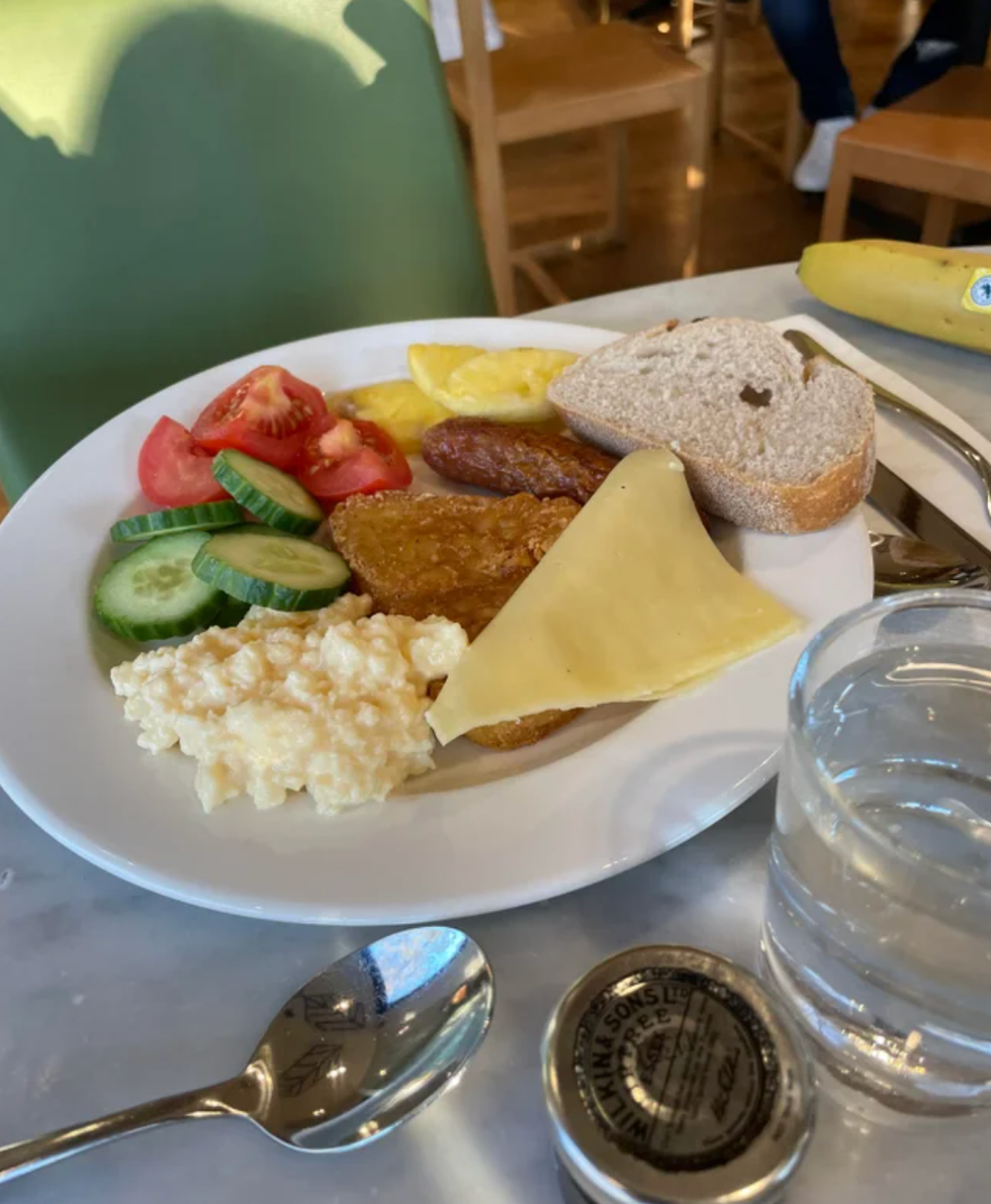 The plate also included one hashbrown with a slice of cheese on top and what appears to be a few cut-up pieces of pineapple.