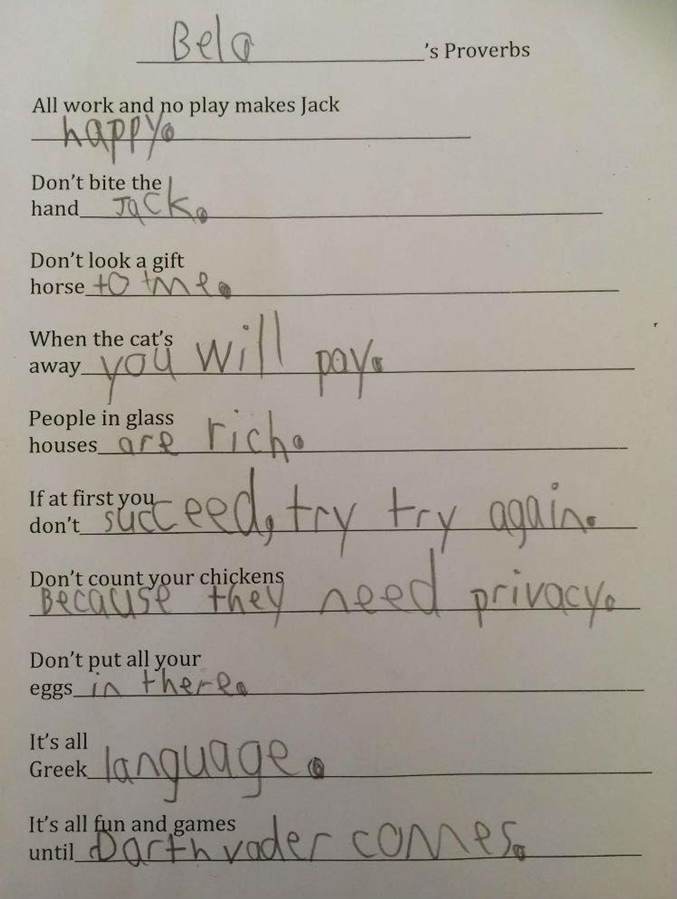 Asked to finish the sentences of some of the most famous proverbs in the English language, or perhaps tasked with making her own, this child came up with some superb alternatives...