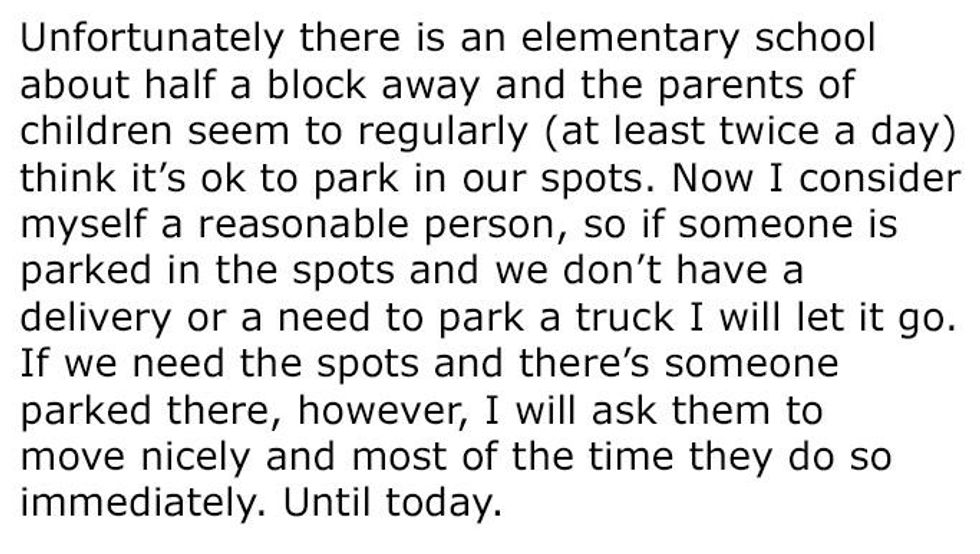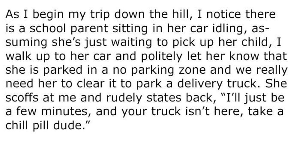 A lot to unpack here. First of all, new character alert. Secondly, there is no excuse for someone parking in a spot when it is clearly marked 'no parking'. Thirdly... Take. A. Chill. Pill. Just, why?