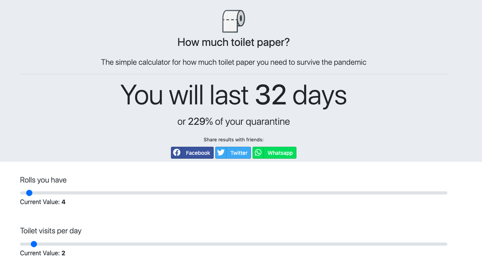 The website was created by London-based student software developer Ben Sassoon and artist Sam Harris, and is based on how much paper they use on a day-to-day basis and how that could change during the pandemic, as the average person now has 500 per cent more toilet paper than they would usually have.