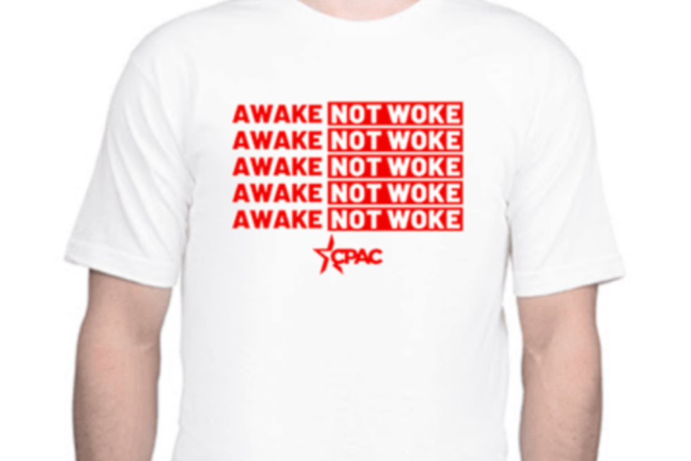 This could presumably be an attempt to come up with a new term that trumps (no pun intended) "woke." You can also sport "Awake Not Woke" as beverage coolers and lapel stickers.
