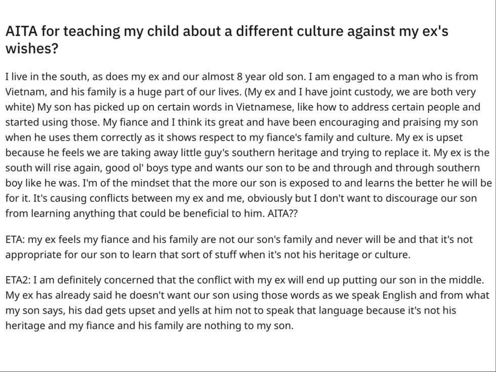One mother has taken to Reddit to share her struggles with her ex, detailing his fury at their eight-year-old son’s exposure to her new fiancé’s culture.