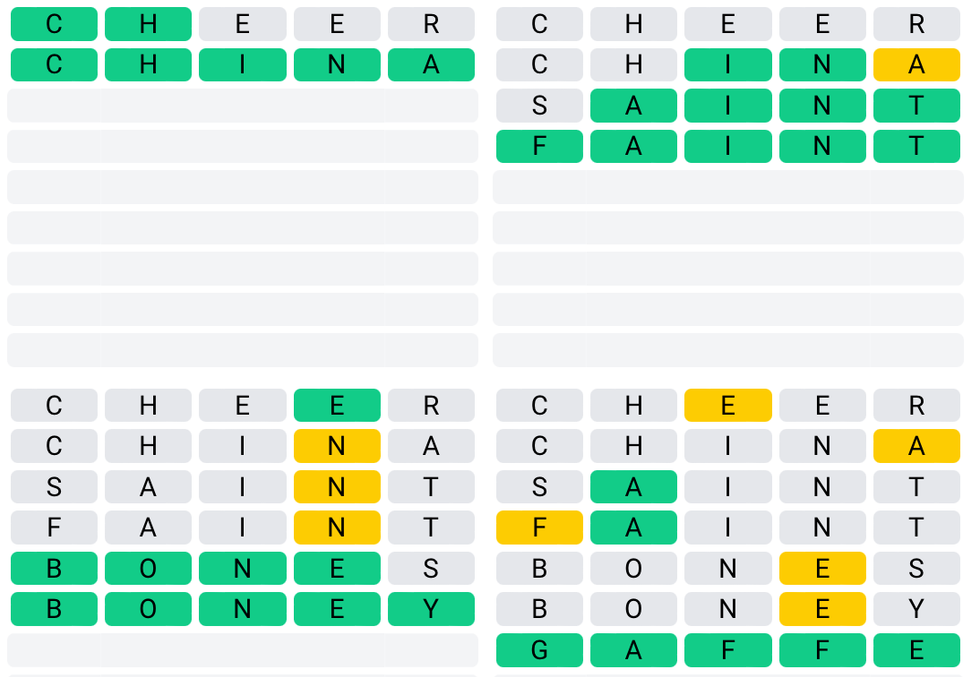 You have nine chances to guess all four words. Each attempt populates all four grids.