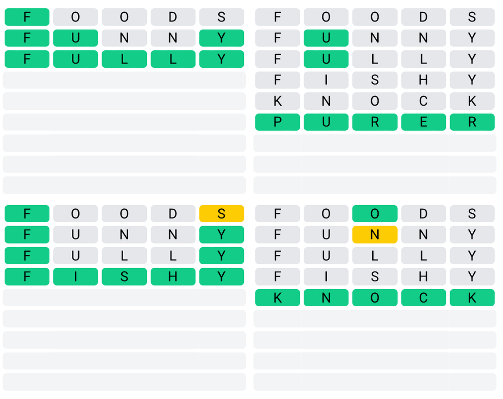 You have nine chances to guess all four words. Each attempt populates all four grids.