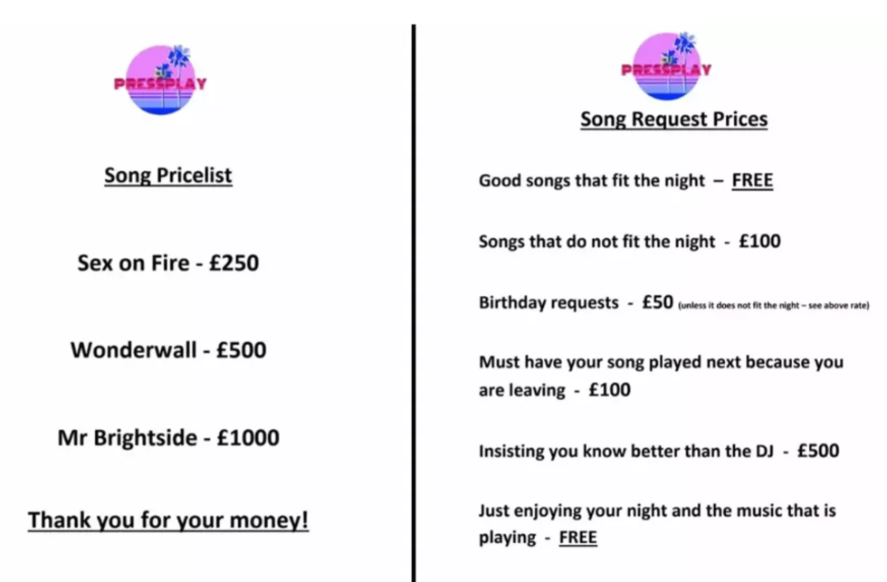The notice also adds a £50 charge for birthday shout outs, and "insisting you know better than the DJ" for £500.