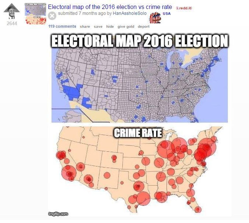 Such as this meme which suggested that a map of Democratic support in the US was a graphic match with a map of crime in the USA.