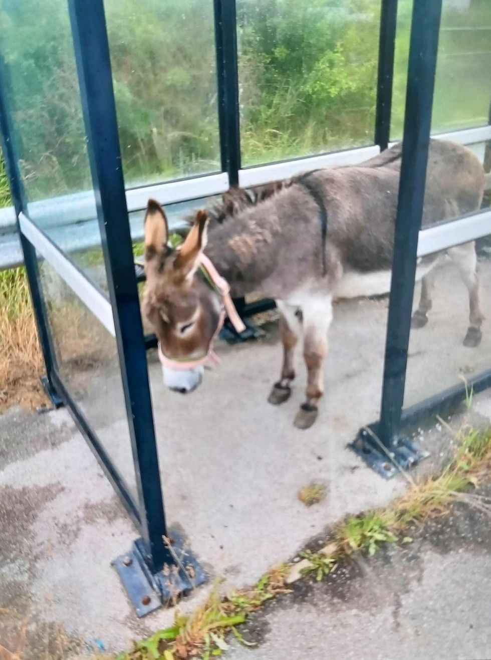 A sad-looking donkey pictured at a bus stop was returned home by police who joked it was trying to run off to the seaside to start a new career on the beach.