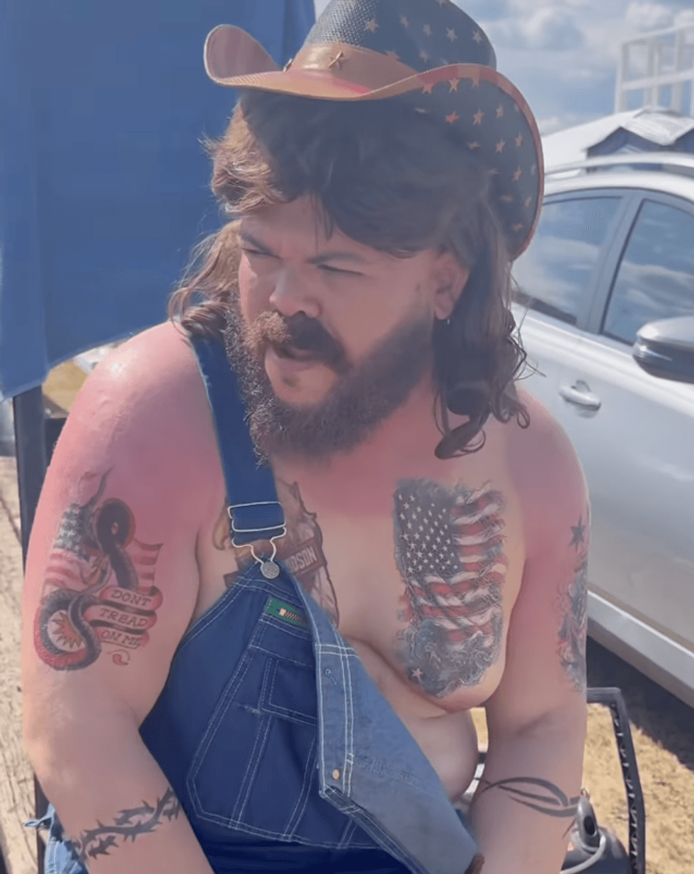 Back in September 2025, Druski attended a NASCAR event in full disguise as a white Southern patriot. We're talking complete transformation: fake tan lines, a mullet, arm tattoos, a bushy beard, denim overalls, and an American flag cowboy hat.