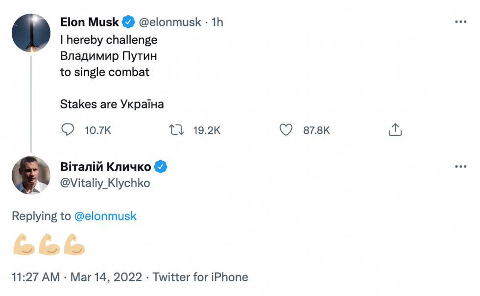 I hereby challenge\n\u0412\u043b\u0430\u0434\u0438\u043c\u0438\u0440 \u041f\u0443\u0442\u0438\u043d \nto single combat\n\nStakes are \u0423\u043a\u0440\u0430\u0457\u043d\u0430— Elon Musk (@Elon Musk) 1647256162