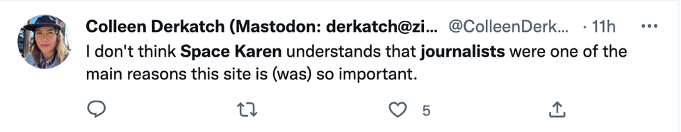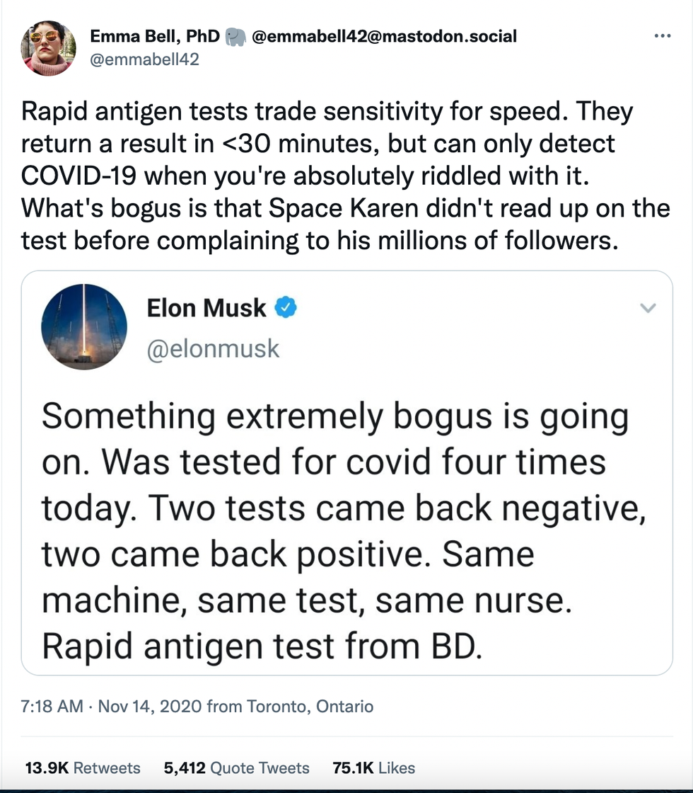 "What's bogus is that Space Karen didn't read up on the test before complaining to his millions of followers," Dr Emily Bell wrote.
