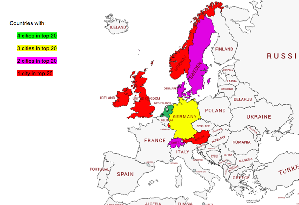 The Netherlands leads the way, with four cities in the top 20. Germany follows with three while Sweden, Denmark and Switzerland have two apiece.