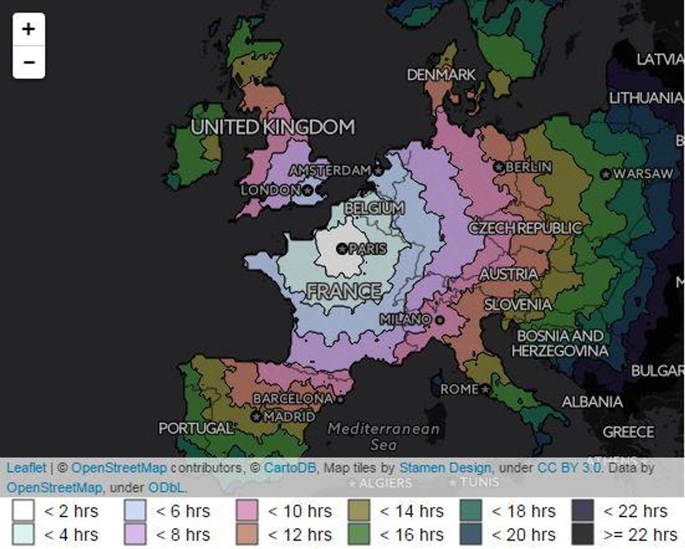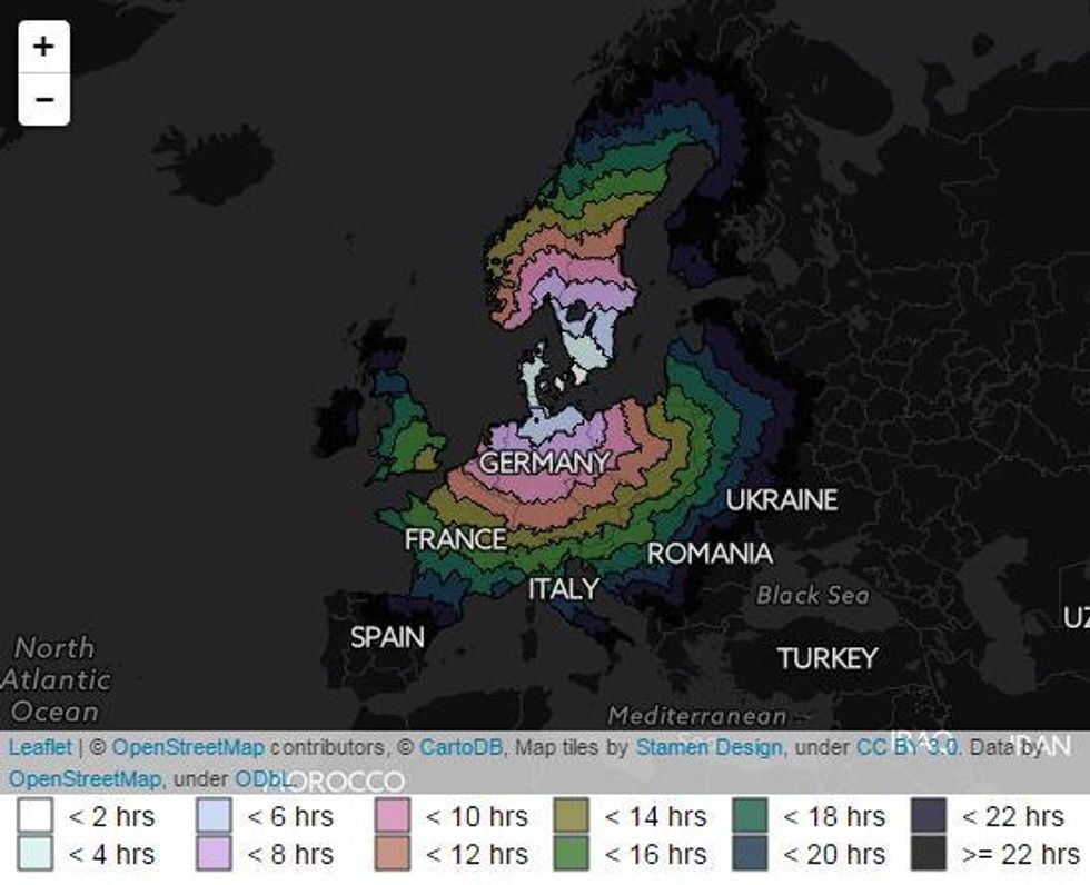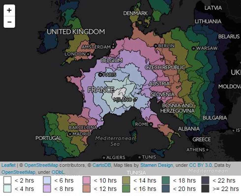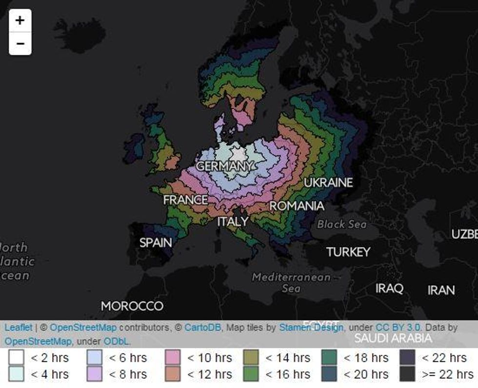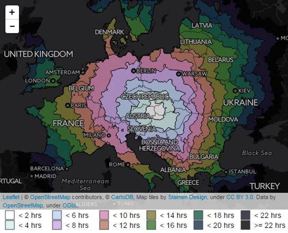 He said his motivation was an isochrome map of travel from Vienna around 1881, as he wanted to update the concept for the modern day: