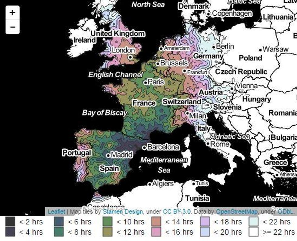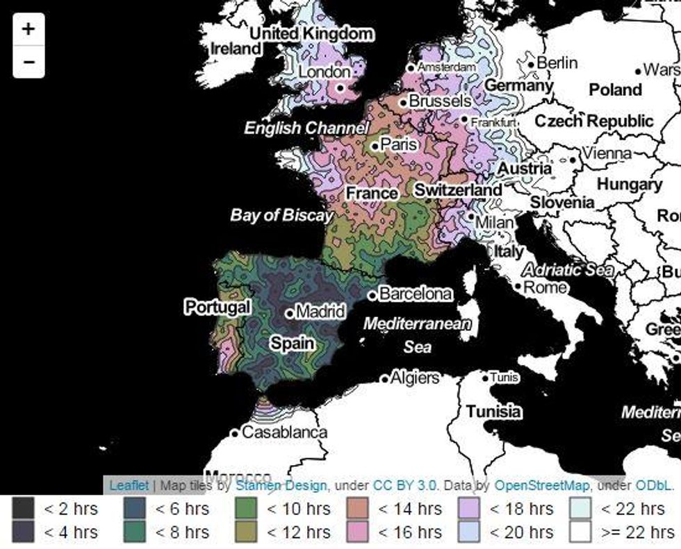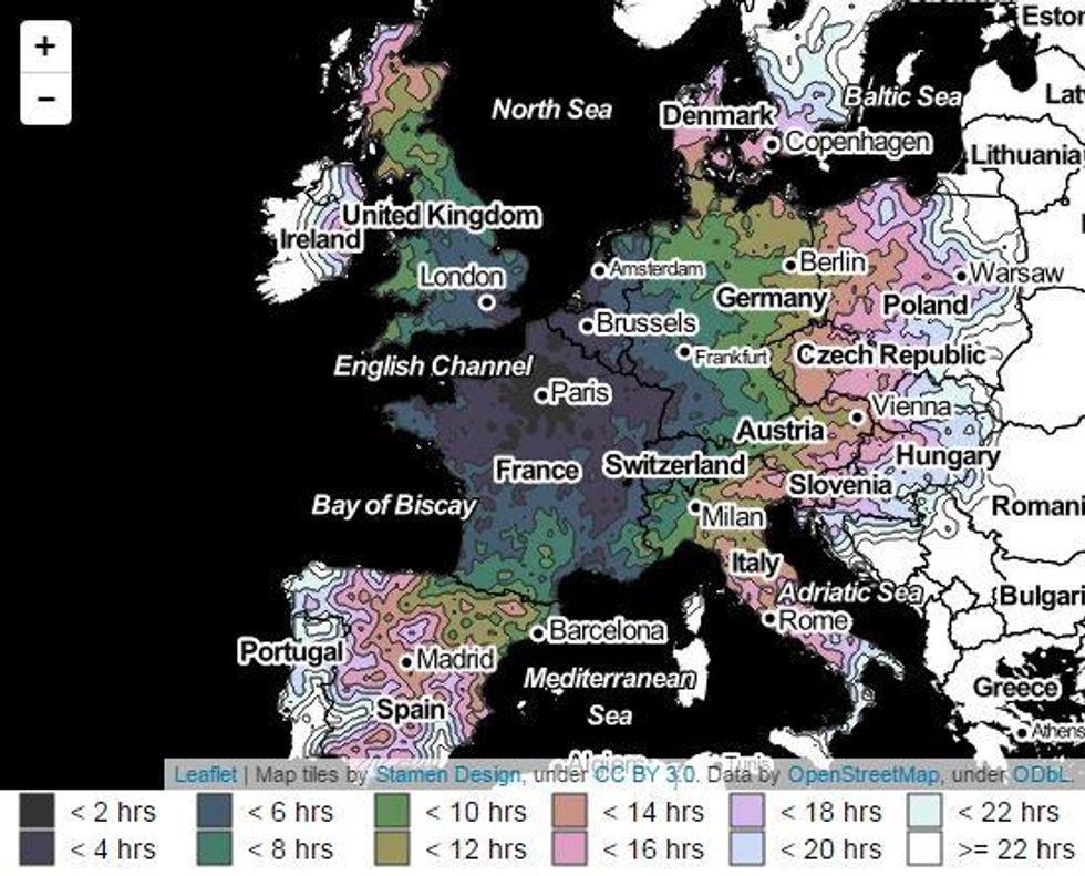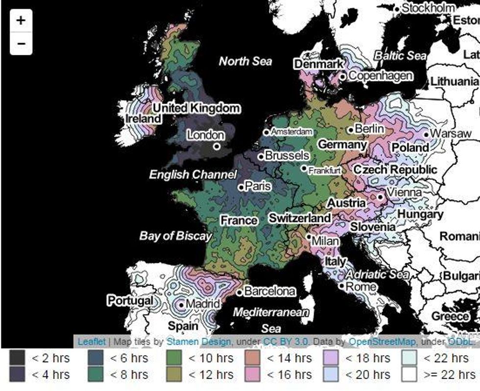Questions such as 'how much darker is point A than point B?' and 'what actual time does a particular shade correspond to?' are resolved using the interactive maps (i.e. Vienna, Paris, London, Berlin), but these fail to provide the information at a mere glance.