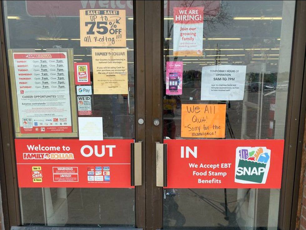 The Family Dollar store in Lincoln, Nebraska, was left unmanned after staff united in protest at alleged low pay and long shifts.