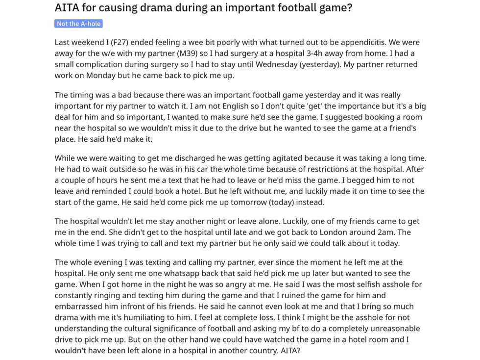 The devastated girlfriend – who said that she’s not English herself – ended her post by asking fellow Redditors whether she was at fault for “not understanding the cultural significance of football and asking my boyfriend to do a completely unreasonable drive to pick me up.”
