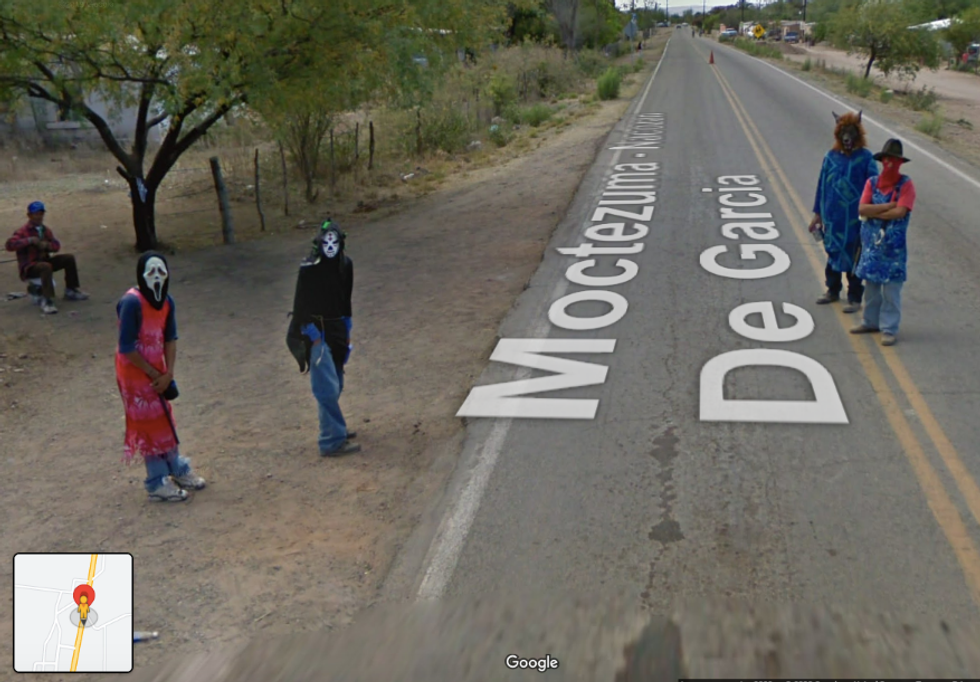 While it's impossible to be sure, it's either cartel members or people dressing up in terrifying Halloween costumes in the image. Still, it’s certainly not something you come across every day on Google Street View - and we wouldn't fancy coming across them either way.