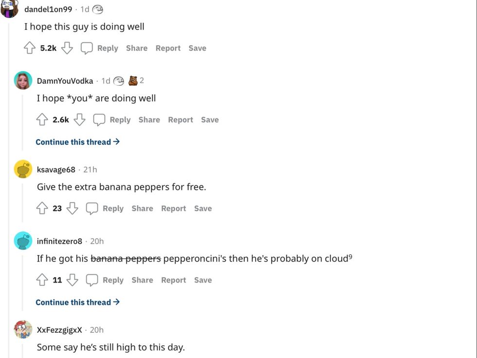 Many of which were well-wishes for the anonymous customer with hopes that he received free extra peppers.