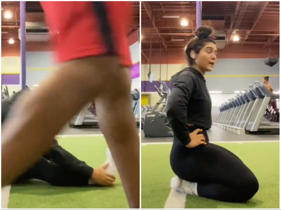 In the clip, she explains that she was recording her exercises and stretches when she was interrupted by at least two people.