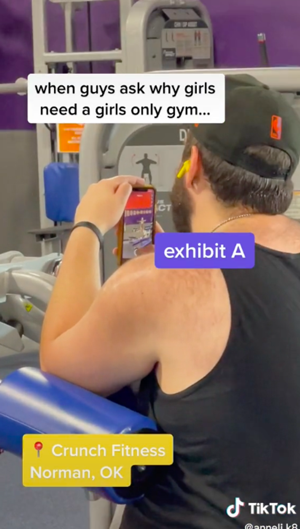 A video captured by TikTok user @anneli.k8 shows a man sitting on a piece of gym equipment while he casually films a woman working out opposite him.