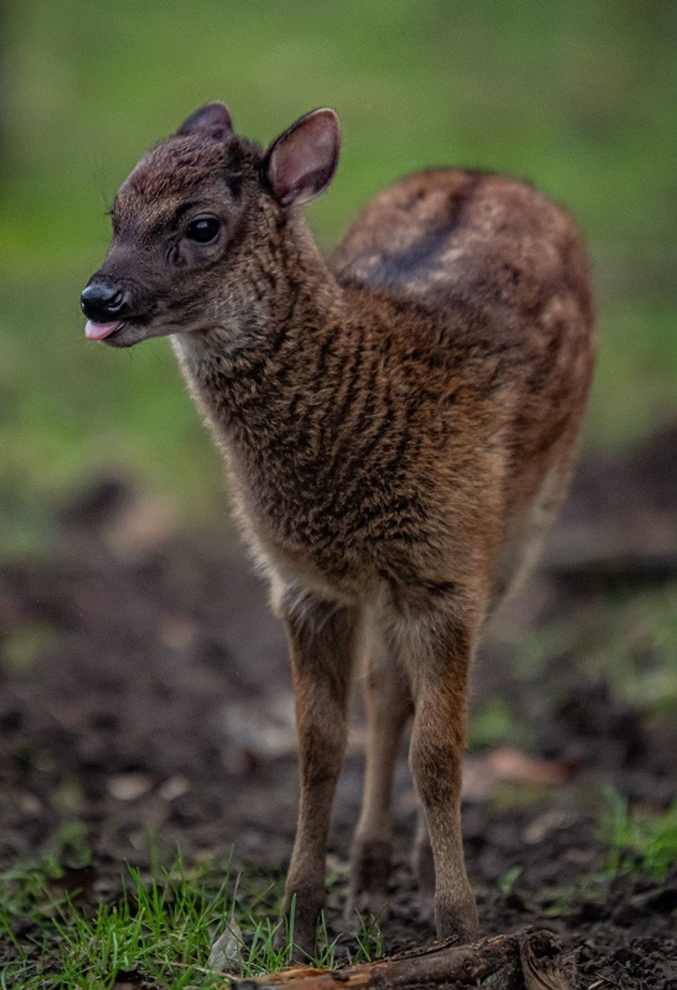 A highly endangered species of deer has been pictured for the first time after it was born at Chester Zoo, Cheshire, in December 2021.