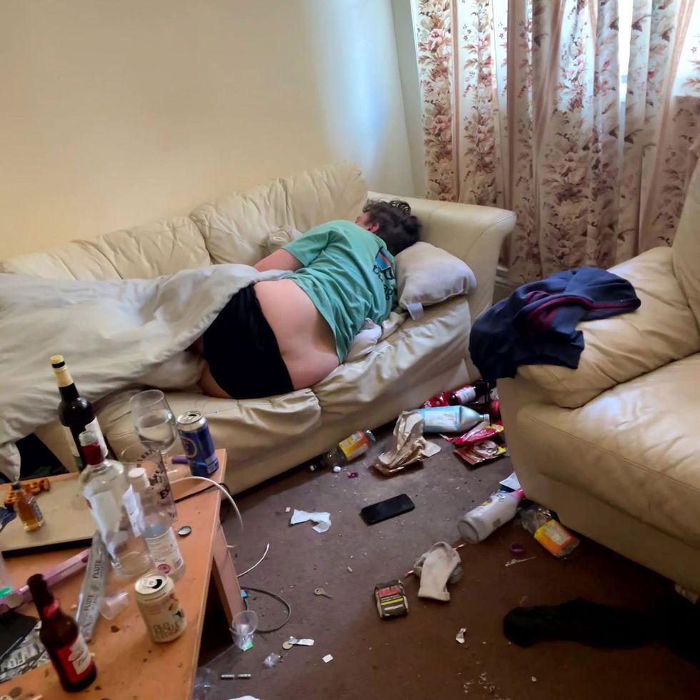 There was a bottle of vodka and beer bottles on the table and litter - including a fag packet and food wrappers - scattered across the floor.
