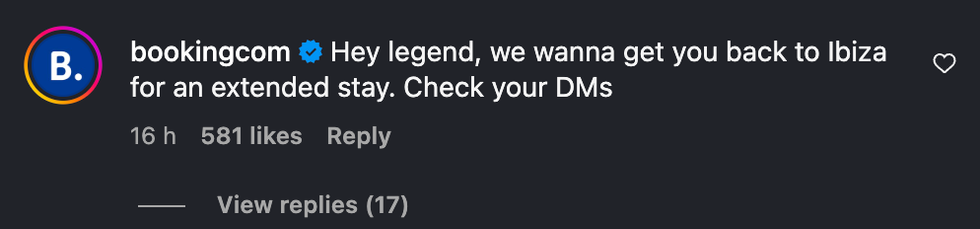 Underneath a post from the Ibiza final boss, one line travel agency booking.com commented: "Hey legend, we wanna get you back to Ibiza for an extended stay. Check your DMs."