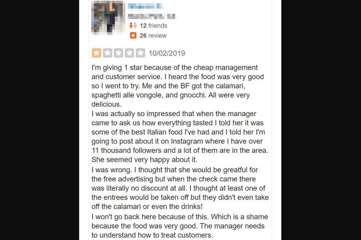 “I thought that she would be grateful for the free advertising but when the check came there was literally no discount at all.
