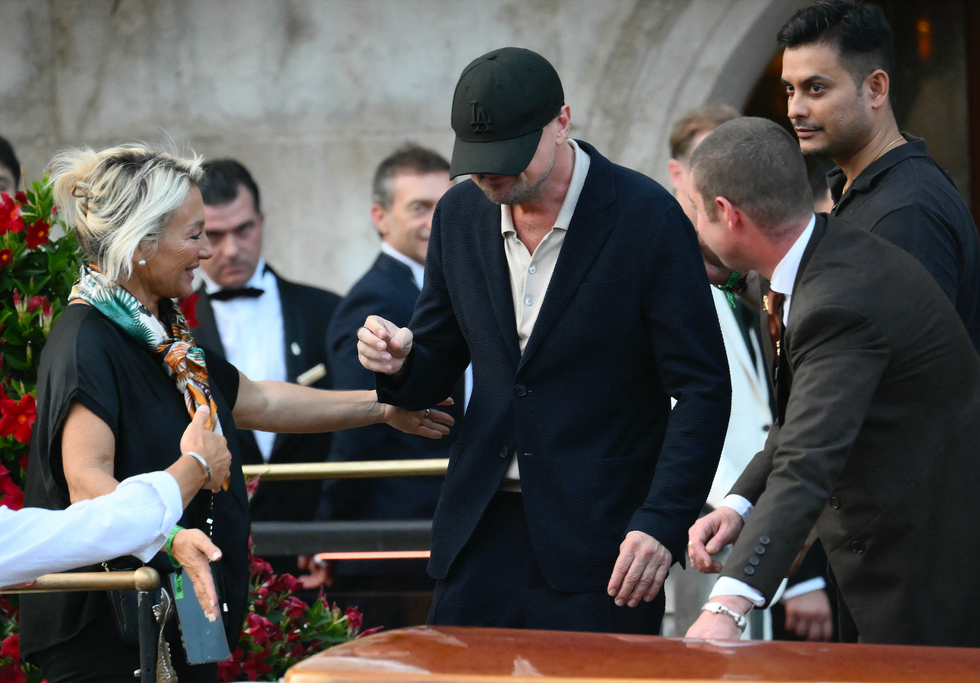 Leonardo DiCaprio was spotted departing a hotel, wearing a black LA Dodgers cap as he was guided onto a boat.