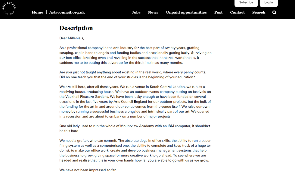 The job ad starts, "Dear millenials," - and yes, that's not quite how you spell it. Everyone is human though! Let's continue.