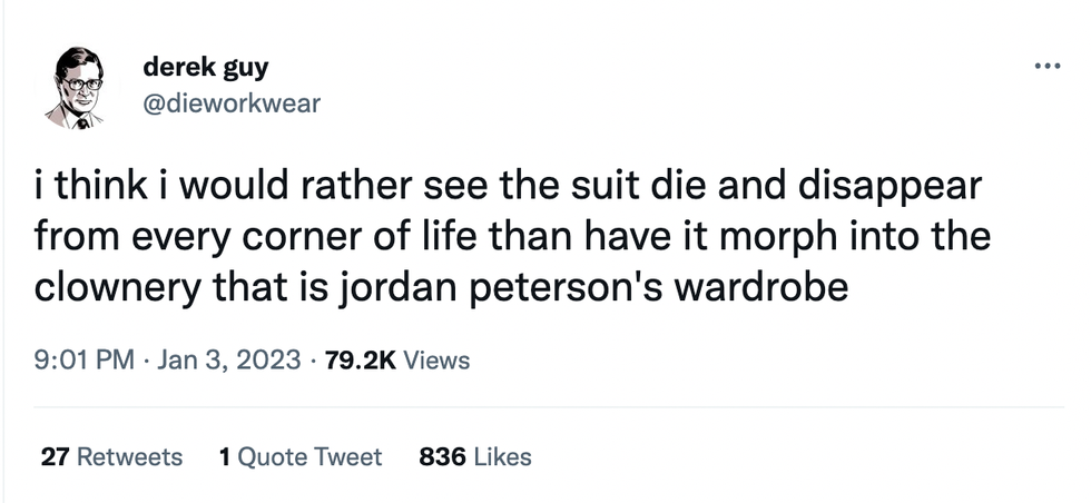 \u201cokay we need to stage an intervention for jordan peterson. a wardrobe intervention \ud83e\udd23\u201d— Brad Polumbo \ud83c\uddfa\ud83c\uddf8\u26bd\ufe0f\ud83c\udff3\ufe0f\u200d\ud83c\udf08 (@Brad Polumbo \ud83c\uddfa\ud83c\uddf8\u26bd\ufe0f\ud83c\udff3\ufe0f\u200d\ud83c\udf08) 1673413653
