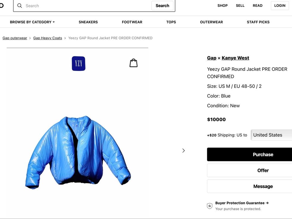 The Yeezy x Gap jacket has already hit reseller websites. On the luxury buy and sell site, Grailed, the blue Round Jacket has been added at an unbelievable $10,000.