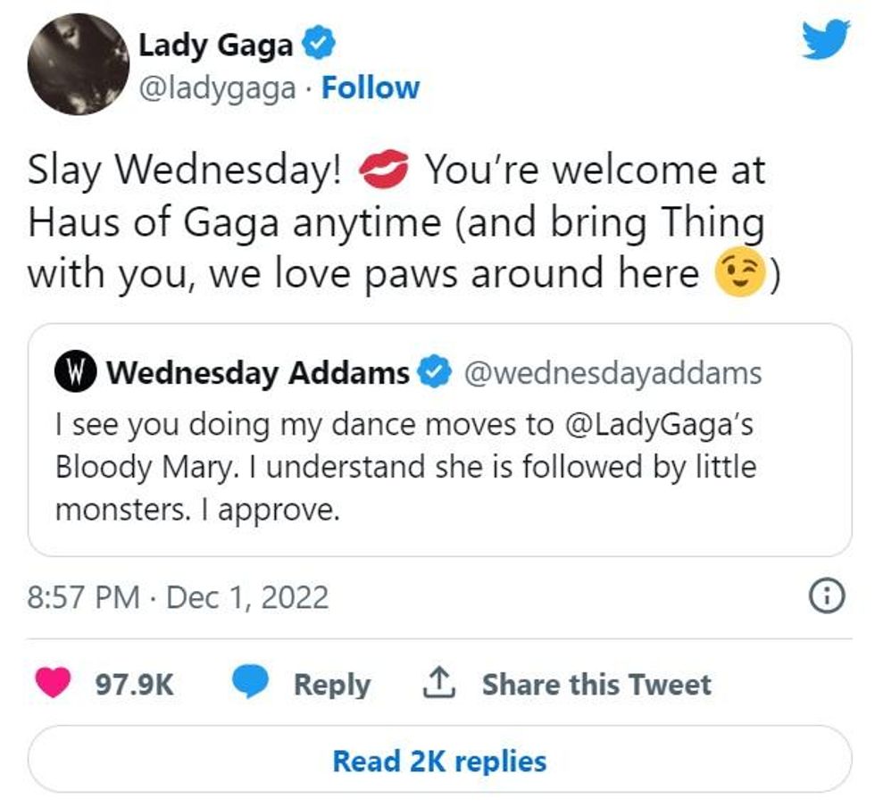 The trend has even captured the attention of Gaga herself who took to Twitter to respond to the Wednesday Addam's official account that gave the fictional character's "approval" of Bloody Mary.