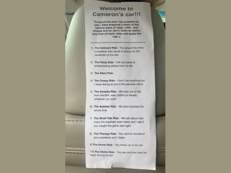 In a print-off stuck to the back of his seat, the motorist, called Cameron, welcomes passengers to his car and urges them to choose from a list of 10 ride styles.