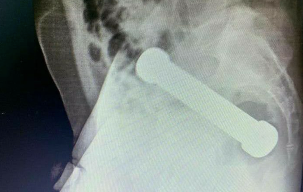 The X-rays spotted a metallic 2kg dumbbell which was about 20cm long and lodged in the area where the colon meets the rectum.