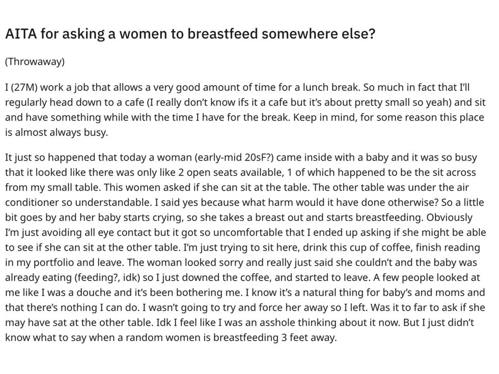 “I get that not everyone grows up comfortable around bodies and nudity but bro. Breastfeeding is 0% sexual. And if it really bothered you, you should’ve moved to the less desirable spot.”