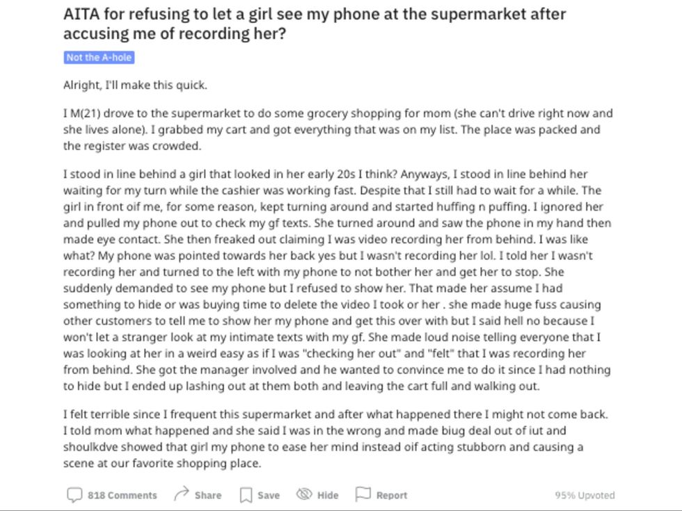 However, a Reddit user has now spoken out in self-defence after he was accused of inappropriately filming a fellow shopper at a supermarket.