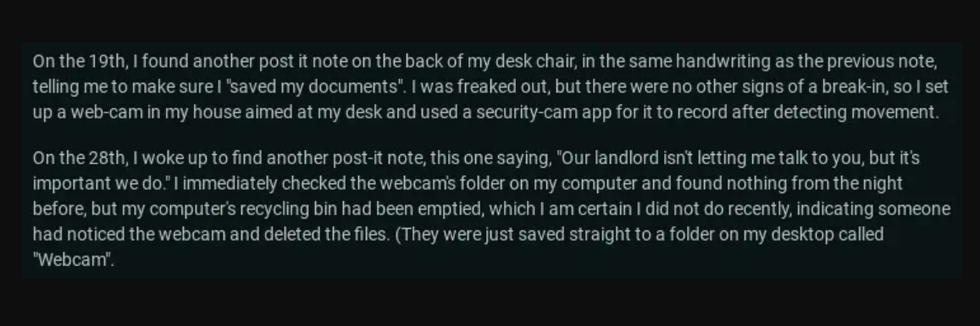 At that point, they began setting up a webcam to try and catch any intruders. However, after finding another note reading: "Our landlord isn't letting me talk to you, but it's important we do."