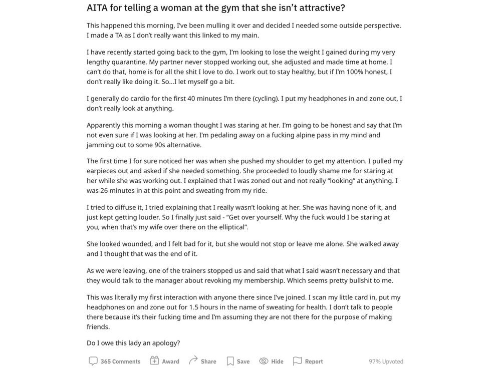 The Reddit user explained in a lengthy post that the fellow gym-goer had accused him of “staring” at her, prompting him to tell her to “get over herself” while insisting he didn’t find her attractive.