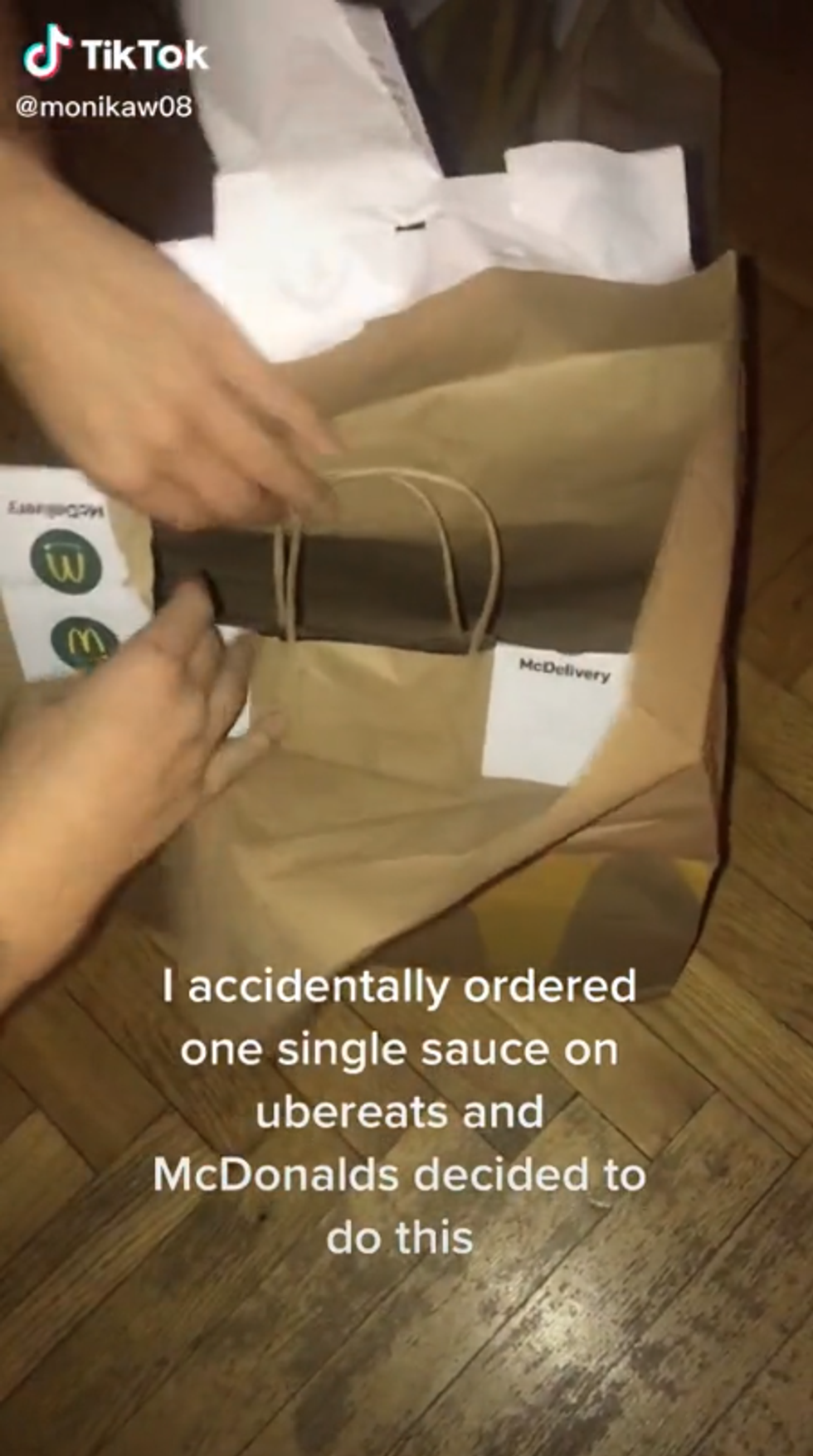 In a video shared by an account going by the name of Monikaw, they write “I accidentally ordered one single sauce on UberEats and McDonald’s decided to do this.”