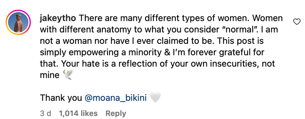Model Jake hit back at the negative comments, saying that he has never "claimed to be" a woman and that the post is simply "empowering a minority" which he's "forever grateful for".