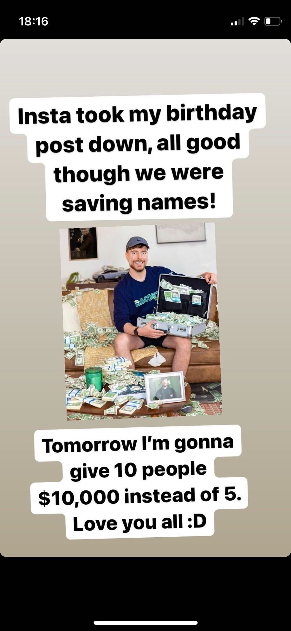 In a since removed Instagram post, he explained: “It’s my birthday, so I’m giving away $50,000 to 5 followers! ($10,000 each!)”