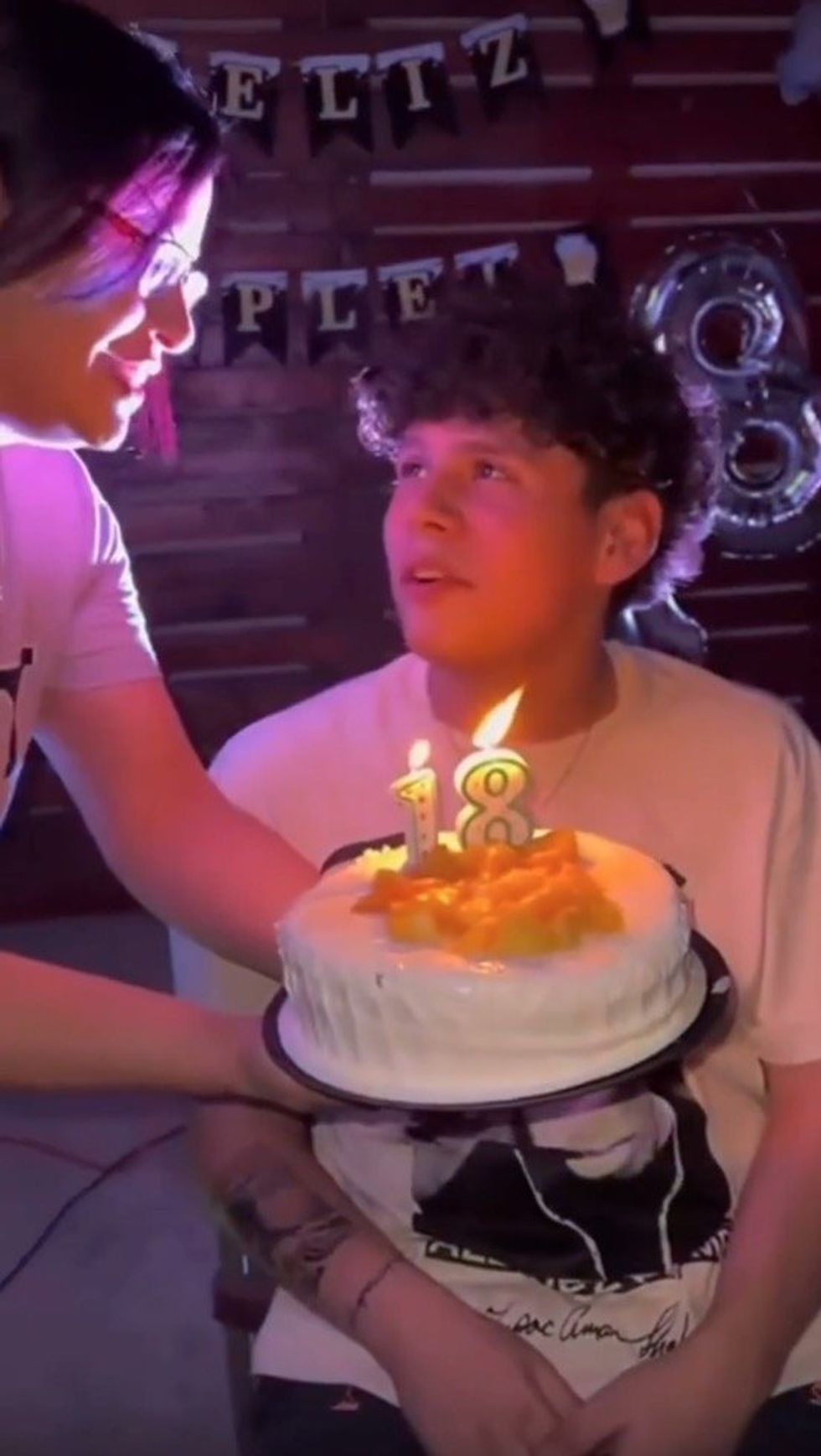 The unnamed mother is seen carrying a cake for her lad, seated in the middle of a dark room with several pals looking on from the side.